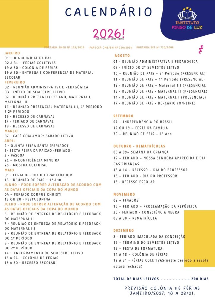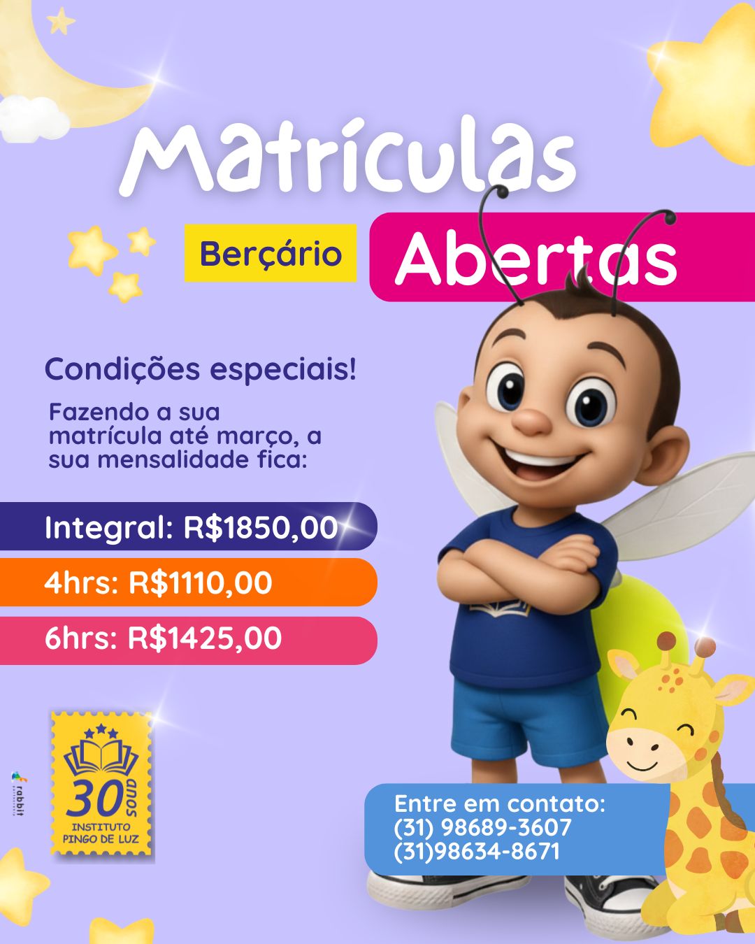 O Instituto Pingo de Luz atende crianças do berçário (a partir de 4 meses) ao 1º ano do fundamental (6 anos).